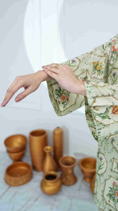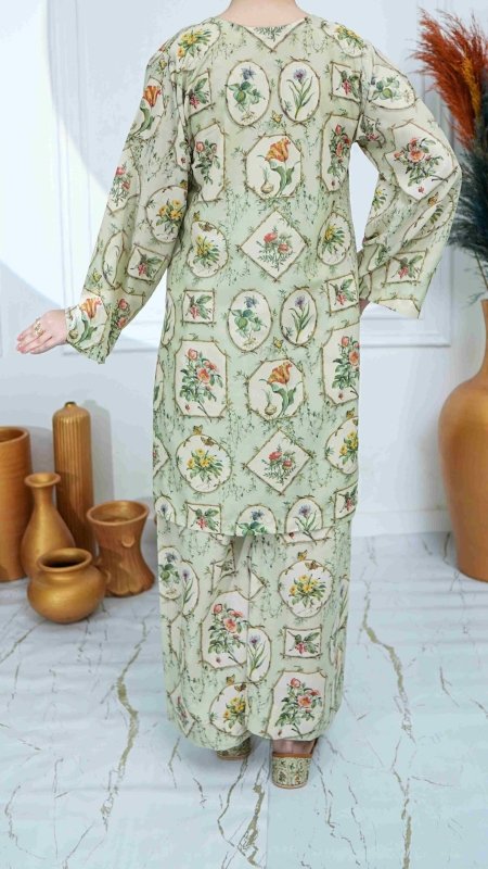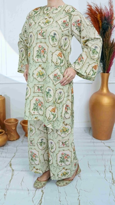 This stitched set showcases an intricate botanical print, featuring framed florals in a soothing palette of earthy greens, soft beige, and vibrant blooms. Its wider width fabric allows you to customize it into your desired outfit style, from classic straight-cut designs to modern silhouettes.
