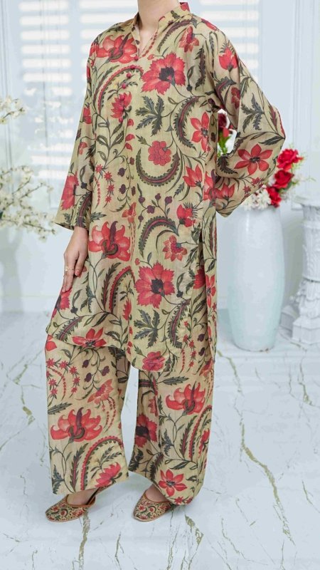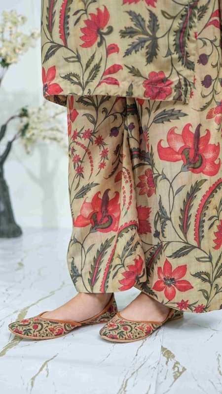 This stitched set showcases an intricate botanical print, featuring framed florals in a soothing palette of earthy greens, soft beige, and vibrant blooms. Its wider width fabric allows you to customize it into your desired outfit style, from classic straight-cut designs to modern silhouettes.