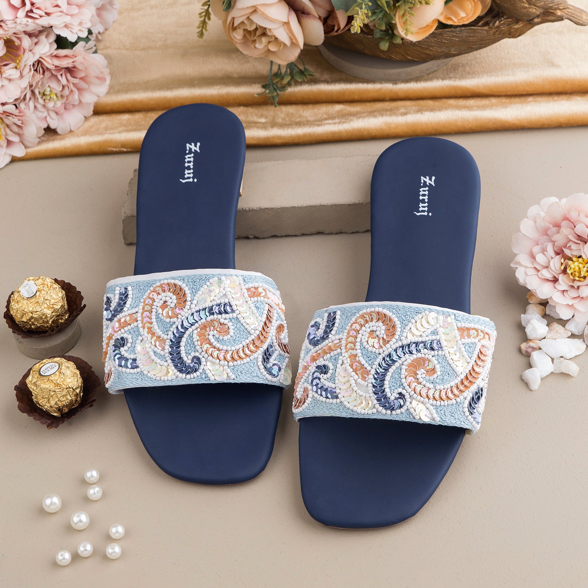FL-42-NAVY BLUE is a quintessential exemplary of pleasant, luxurious and traditional artistry FLATS made with beautiful hand made work . These are the adorable heritages of Pakistan that are hand-sewed by determined cordwainers of rural areas to exhibit the utmost beauty of prepossessing feet.