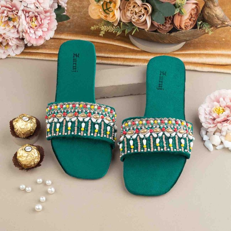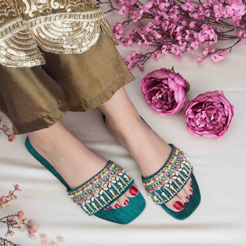 FL-44-Green is a quintessential exemplary of pleasant, luxurious and traditional artistry FLATS made with beautiful hand made work on Fabric . These are the adorable heritages of Pakistan that are hand-sewed by determined cordwainers of rural areas to exhibit the utmost beauty of prepossessing feet.