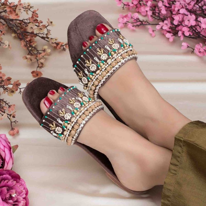 FL-46 is a quintessential exemplary of pleasant, luxurious and traditional artistry FLATS made with beautiful hand made work on Fabric . These are the adorable heritages of Pakistan that are hand-sewed by determined cordwainers of rural areas to exhibit the utmost beauty of prepossessing feet.