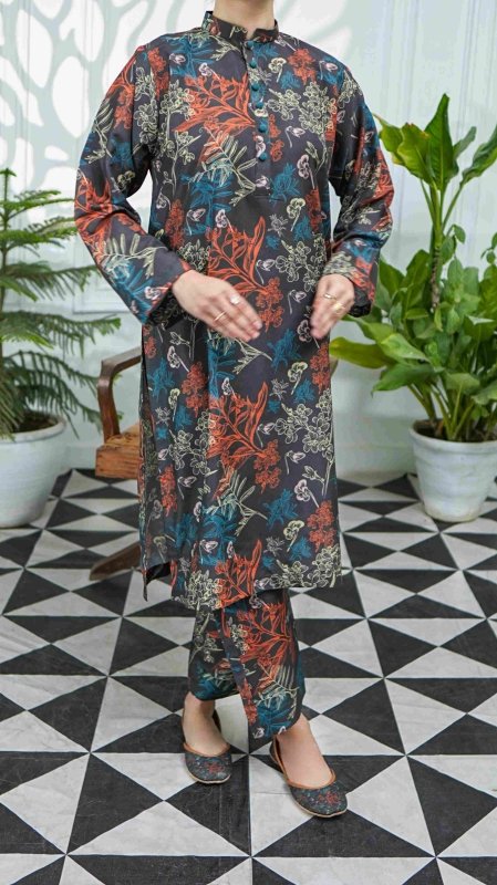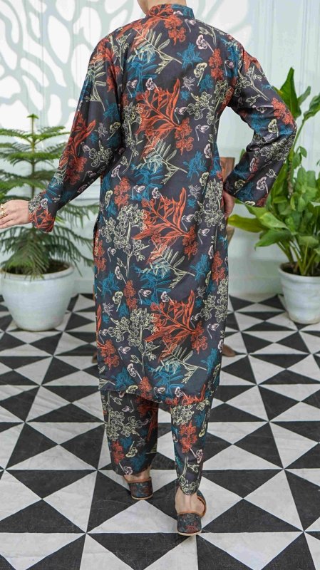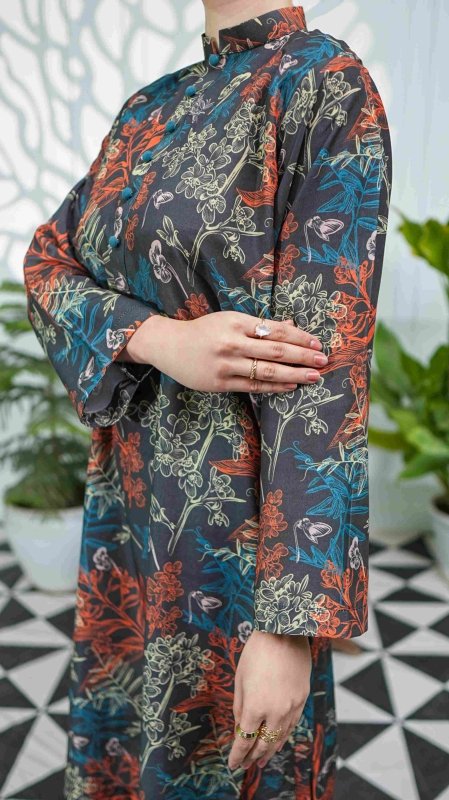 This stitched set showcases an intricate botanical print, featuring framed florals in a soothing palette of earthy greens, soft beige, and vibrant blooms. Its wider width fabric allows you to customize it into your desired outfit style, from classic straight-cut designs to modern silhouettes.